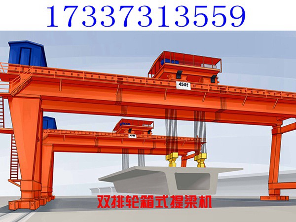 廣西賀州提梁機廠家17337313559的提梁機既可兩臺配合抬吊預制梁,也可以單臺起重機配雙吊具起吊預制梁,兩臺同時起重的提梁機各自的起重量一般為450噸,單臺起重的提梁機起重量通??蛇_900噸。它配置支腿行走、天車行走及天車起吊設備,可以實現全方位機械化動作。主要用于將預制梁從制梁臺提吊至存梁臺位,預制梁養護完成后將其從存梁臺位吊運到運梁車上。作為起重設備完成架橋機的組裝和拆卸。提梁機還用于架設墩身不高的旱橋。