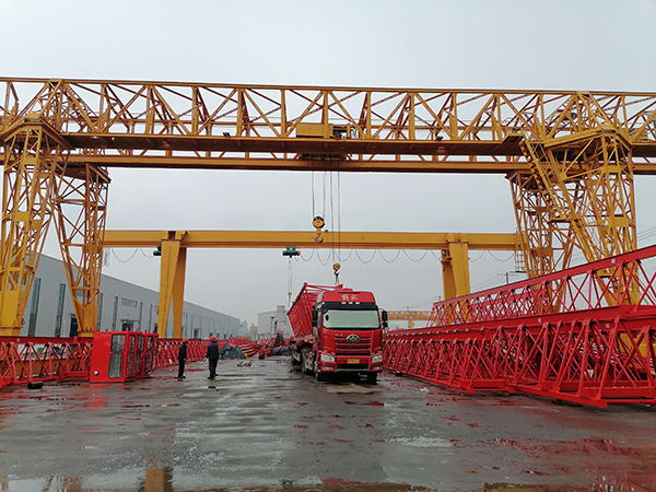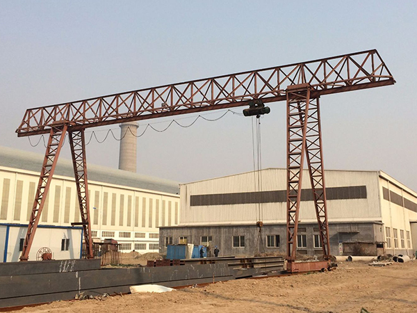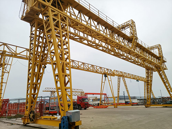 門式起重機是橋式起重機的一種變形,又叫龍門吊。門式起重機具有場地利用率高、作業范圍大、適應面廣、通用強等特點,它的金屬結構像門形框架,承載主梁下安裝兩條支腳,可以直接在地面的軌道上行走,主梁兩端可以具有外伸懸臂梁。