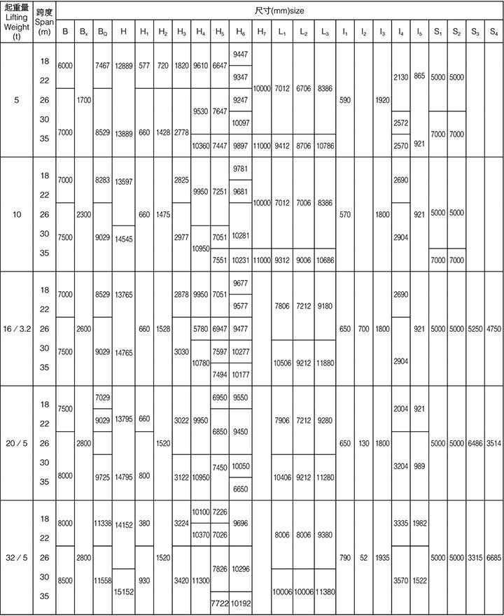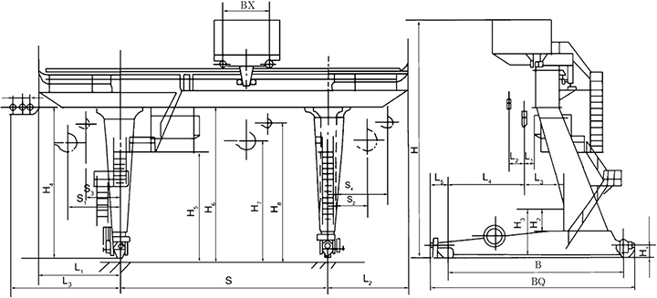 L型單主梁吊鉤門式起重機起升高度: 10M-16M 起升重量: 5T-32T 跨度: 15M-35M 工作環境; -25℃—+40℃ 起升速度: 7.16M/MIN-20M/MIN 運行速度: 39.5M/MIN-48.3M/MIN