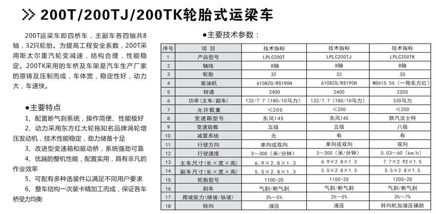 運梁車,將在預制廠或橋梁現場預制的鋼筋混凝土梁橋橋面板運送到架橋機的專用車輛。分軌行式和輪胎式等。主要由幾十個驅動輪與從動輪、車架、駕駛室、操縱控制系統、輔助裝置等組成。由于載重大(達千噸),故要求高度低,以降低架橋機總體高度。是架橋機施工的配套設備。