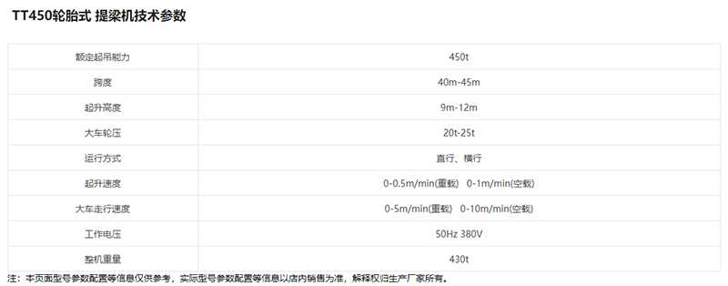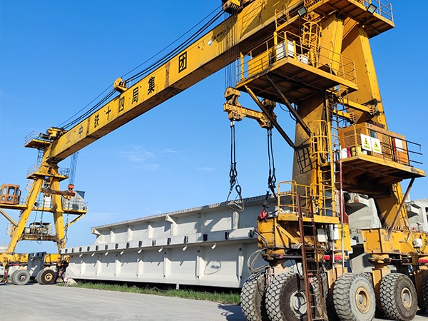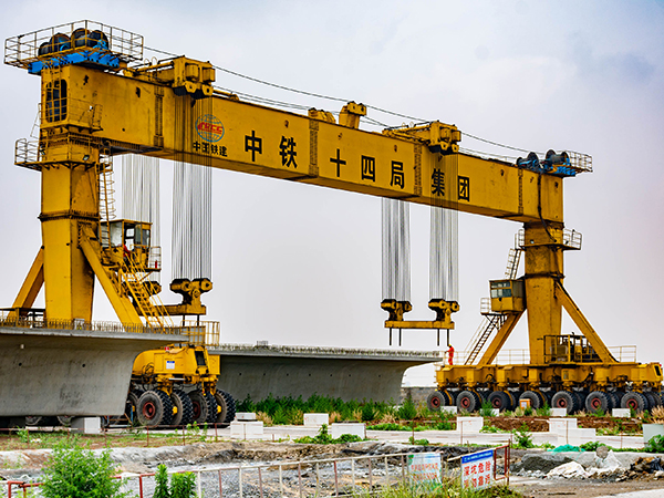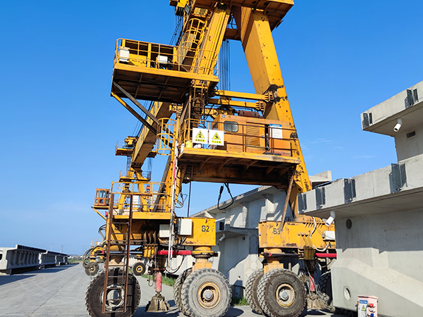 提梁機既可兩臺配合抬吊預制梁,也可以單臺起重機配雙吊具起吊預制梁,兩臺同時起重的提梁機各自的起重量一般為450噸,單臺起重的提梁機起重量通??蛇_900噸。它配置支腿行走、天車行走及天車起吊設備,可以實現全方位機械化動作。主要用于將預制梁從制梁臺提吊至存梁臺位,預制梁養護完成后將其從存梁臺位吊運到運梁車上。作為起重設備完成架橋機的組裝和拆卸。還用于架設墩身不高的旱橋。