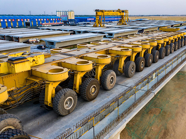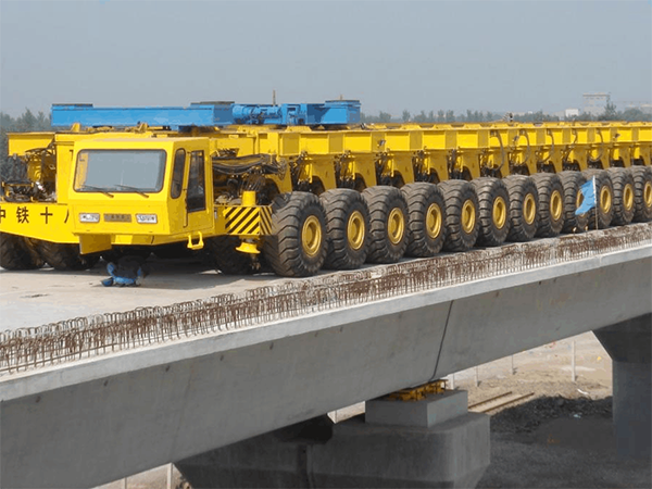 運梁車,又稱運梁平車、運梁炮車、炮車,是將在預制廠或橋梁現(xiàn)場預制的鋼筋混凝土梁橋橋面板運送到架橋機的專用車輛。分軌行式和輪胎式等。主要由幾十個驅動輪與從動輪、車架、駕駛室、操縱控制系統(tǒng)、輔助裝置等組成。由于載重大(達千噸),故要求高度低,以降低架橋機總體高度。是架橋機施工的配套設備。