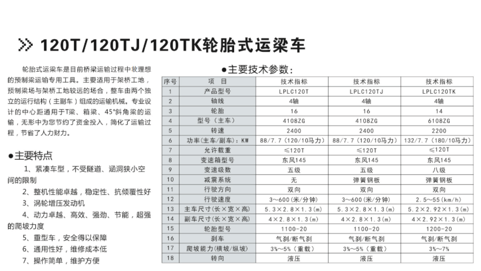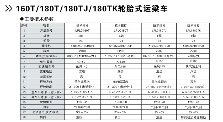 性能介紹:主要適用于預制梁場與架橋工地較遠,不適合鋪軌或鋪軌費用較高的場合。運梁車的剎車系統(tǒng)對縱坡有較大的適應性。輪胎與地面摩擦阻力比軌道式運梁車有顯著的優(yōu)勢。